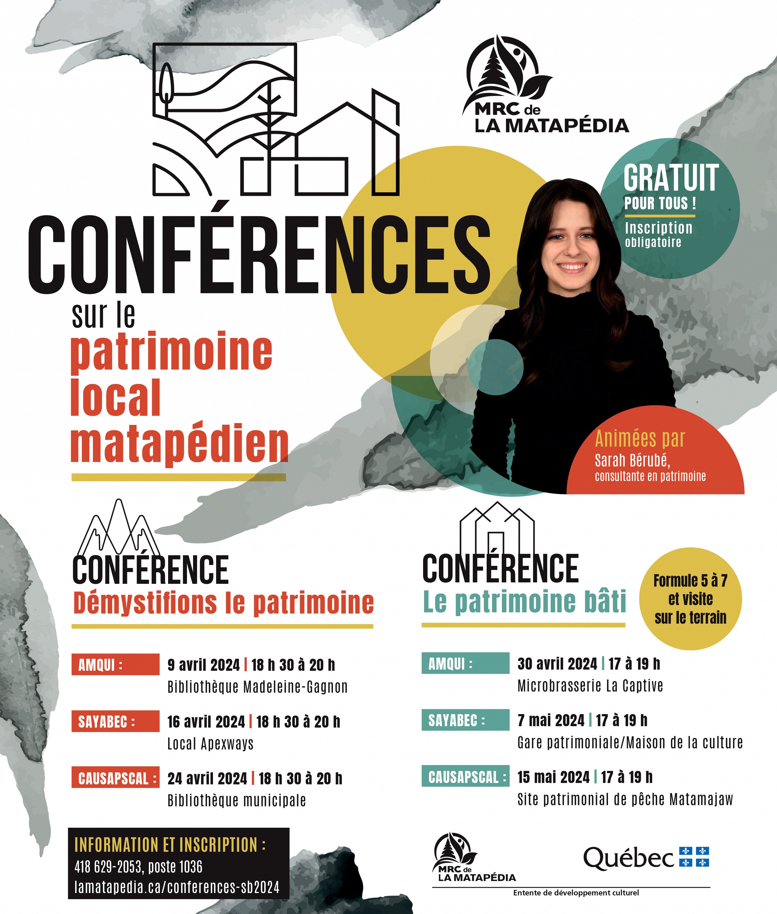 La MRC de La Matapédia est heureuse de lancer une série de conférences grand public gratuites portant sur le patrimoine et qui s’étaleront d’avril à juin 2024. Les activités seront organisées à Amqui, Causapscal et Sayabec et l’inscription en ligne est obligatoire pour les participants via le site https://lamatapedia.ca/conferences-sb2024.