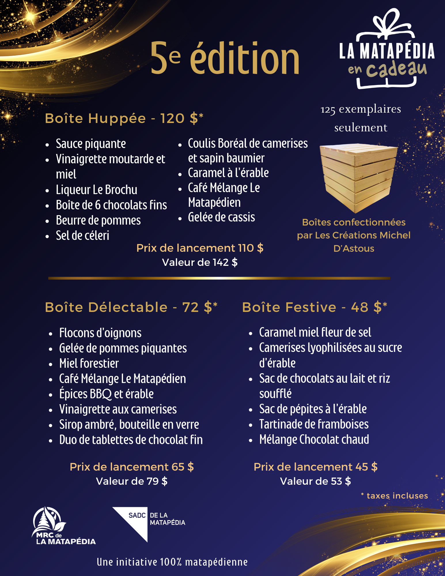 La MRC de La Matapédia et la SADC de La Matapédia sont heureuses de relancer la campagne d’achat local « La Matapédia en cadeau » pour une cinquième année. L’initiative, qui vise à faire découvrir des produits de transformateurs et producteurs locaux, a déjà entraîné près de 140 000 $ en retombées directes totales pour ses quatre premières éditions.
