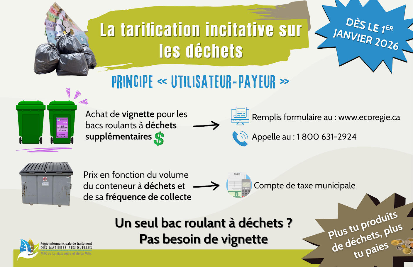 La Régie intermunicipale de traitement des matières résiduelles (RITMR) des MRC de La Mitis et de La Matapédia invite la population à participer aux séances d’information publiques portant sur la mise en place de la tarification incitative des déchets, qui entrera en vigueur le 1er janvier 2026 dans toutes les municipalités des deux territoires.