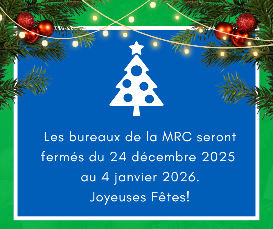 Le centre administratif de la MRC de La Matapédia sera fermé du 24 décembre 2025 au 4 janvier 2026. Il réouvrira ses portes au public à compter du 5 janvier 2026.