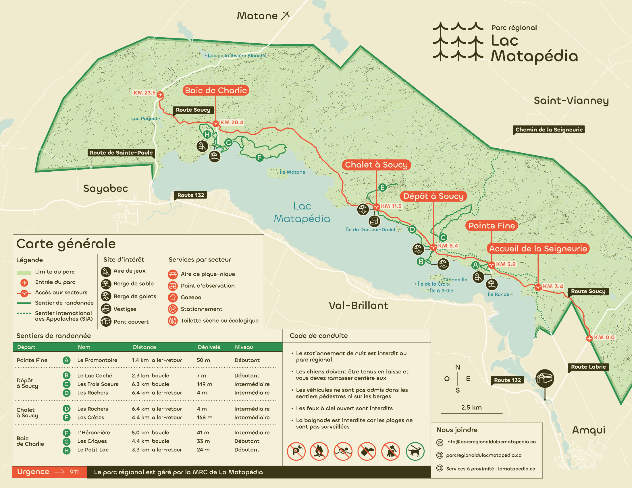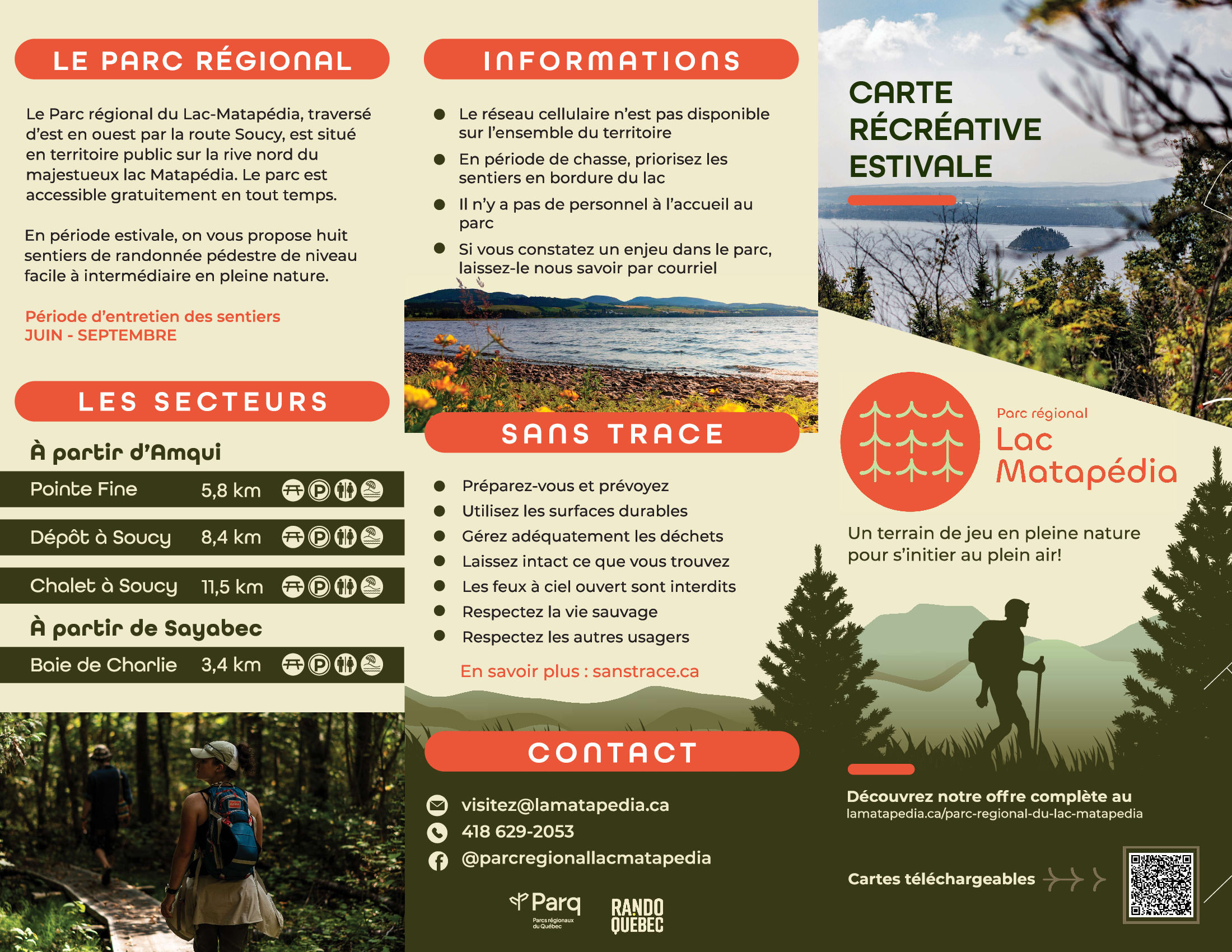 Vous pouvez aussi consulter le dépliant d’information ainsi que la carte du Parc régional du Lac-Matapédia.